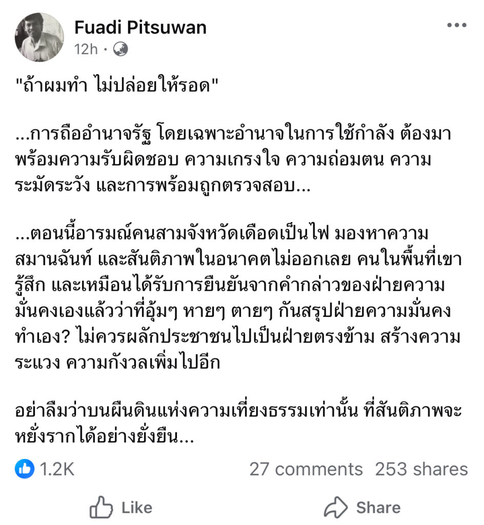 …ตอนนี้อารมณ์คนสามจังหวัดเดือดเป็นไฟ มองหาความสมานฉันท์ และสันติภาพในอนาคตไม่ออกเลย คนในพื้นที่เขารู้สึก และเหมือนได้รับการยืนยันจากคำกล่าวของฝ่ายความมั่นคงเองแล้วว่าที่อุ้มๆ หายๆ ตายๆ กันสรุปฝ่ายความมั่นคงทำเอง? ไม่ควรผลักประชาชนไปเป็นฝ่ายตรงข้าม สร้างความระแวง ความกังวลเพิ่มไปอีก