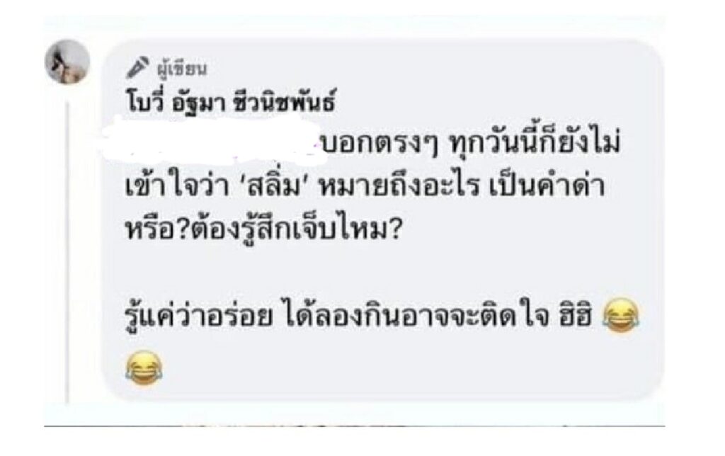 ล่าสุด ในโลกโซเชียลได้มีการแชร์ข้อความ ของโบวี่ ถึงคำว่าสลิ่ม โดยโบวี่ ระบุว่า “บอกตรงๆ ทุกวันนี้ยังไม่เข้าใจว่า “สลิ่ม” หมายถึงอะไร เป็นคำด่าหรือ? ต้องเจ็บไหม ? รู้แค่ว่าอร่อย ถ้าได้ลองกินอาจจะติดใจ ฮิฮิ”