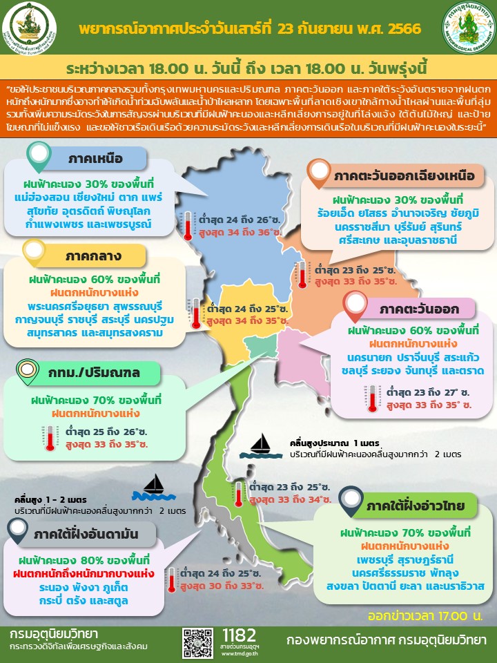 พยากรณ์อากาศ 24 ชั่วโมงข้างหน้า ร่องมรสุมพาดผ่านภาคกลางตอนล่างรวมทั้งกรุงเทพมหานครและปริมณฑล ภาคตะวันออก และภาคใต้ตอนบนเข้าสู่หย่อมความกดอากาศต่ำกำลังแรงบริเวณทะเลจีนใต้ตอนกลาง ประกอบกับมรสุมตะวันตกเฉียงใต้ที่พัดปกคลุมทะเลอันดามัน ภาคใต้ และอ่าวไทย มีกำลังแรงขึ้น ลักษณะเช่นนี้ทำให้ประเทศไทยยังคงมีฝนฟ้าคะนอง และมีฝนตกหนักบางแห่งในภาคกลางรวมทั้งกรุงเทพมหานครและปริมณฑล ภาคตะวันออก และภาคใต้ ขอให้ประชาชนในบริเวณดังกล่าวระวังอันตรายจากฝนตกหนัก ซึ่งอาจทำให้เกิดน้ำท่วมฉับพลันและน้ำป่าไหลหลาก โดยเฉพาะพื้นที่ลาดเชิงเขาใกล้ทางน้ำไหลผ่านและพื้นที่ลุ่ม รวมทั้งเพิ่มความระมัดระวังในการสัญจรผ่านบริเวณที่มีฝนฟ้าคะนอง