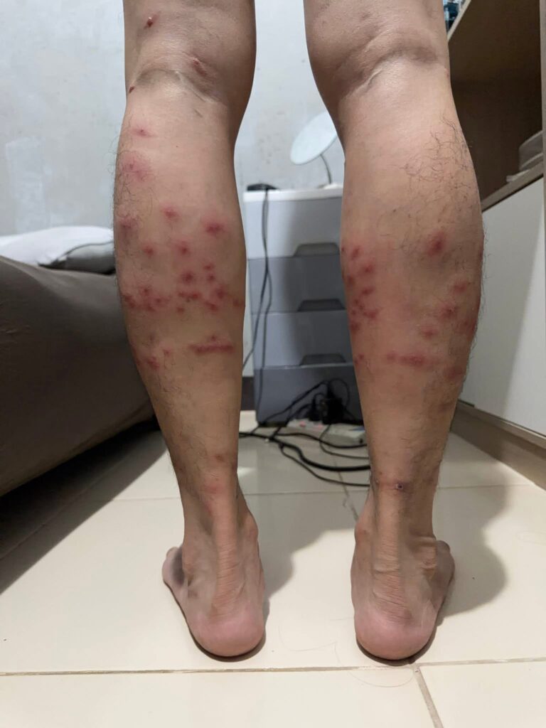 ไปวิ่งบนเขามา อย่าประมาทแมลงตัวจิ๋วครับ! รูปนี้คือตัวอย่างชัดเจนของการโดน “ตัวคุ่น” ตัวเล็กกว่ายุง ใหญ่กว่าแมลงหวี่ รุมกัด ลักษณะเด่นคือแผลจะเป็นตุ่มแดงกระจาย และมีจุดเลือดออกตรงกลาง คันมากและหายยากกว่ายุงหลายเท่า!