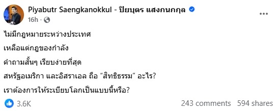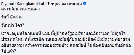 ปิยบุตร ไม่โอเค สหรัฐอเมริกา-อิสราเอล กำลังใช้สิทธิธรรมอะไร ให้การเปิดฉากรบ