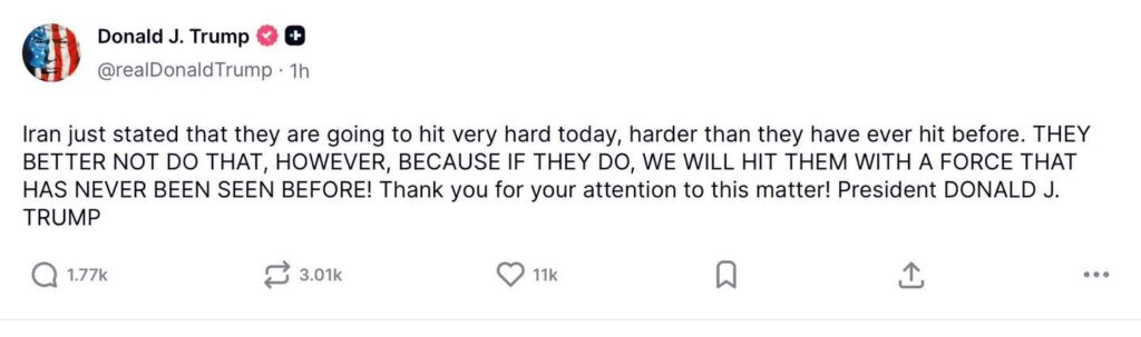 อิหร่านเพิ่งประกาศว่าจะโจมตีอย่างหนักในวันนี้ หนักกว่าที่เคยโจมตีมาทั้งหมด แต่พวกเขาไม่ควรทำเช่นนั้น เพราะถ้าพวกเขาทำ เราจะโจมตีพวกเขาด้วยกำลังที่ไม่มีใครเคยเห็นมาก่อน! ขอบคุณที่ให้ความสนใจในเรื่องนี้!