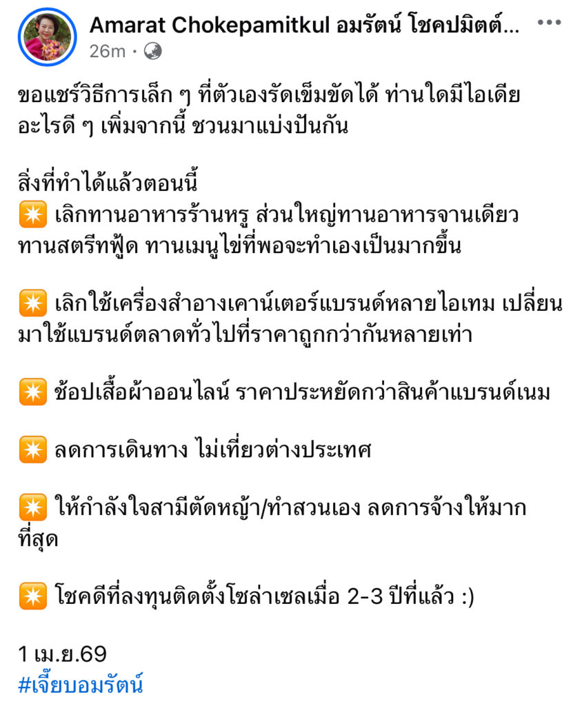 เจี๊ยบ อมรัตน์ แชร์ทริครัดเข็มขัด ยามวิกฤต ให้กำลังใจสามีตัดหญ้า
