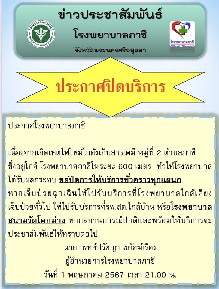 เนื่องจากเกิดเหตุไฟไหม้โกดังเก็บสารเคมี หมู่ที่ 2 ตำบลภาชี ซึ่งอยู่ใกล้ โรงพยาบาลภาชีในระยะ 600 เมตร ทำให้โรงพยาบาลได้รับผลกระทบ ขอปิดการให้บริการชั่วคราวทุกแผนก