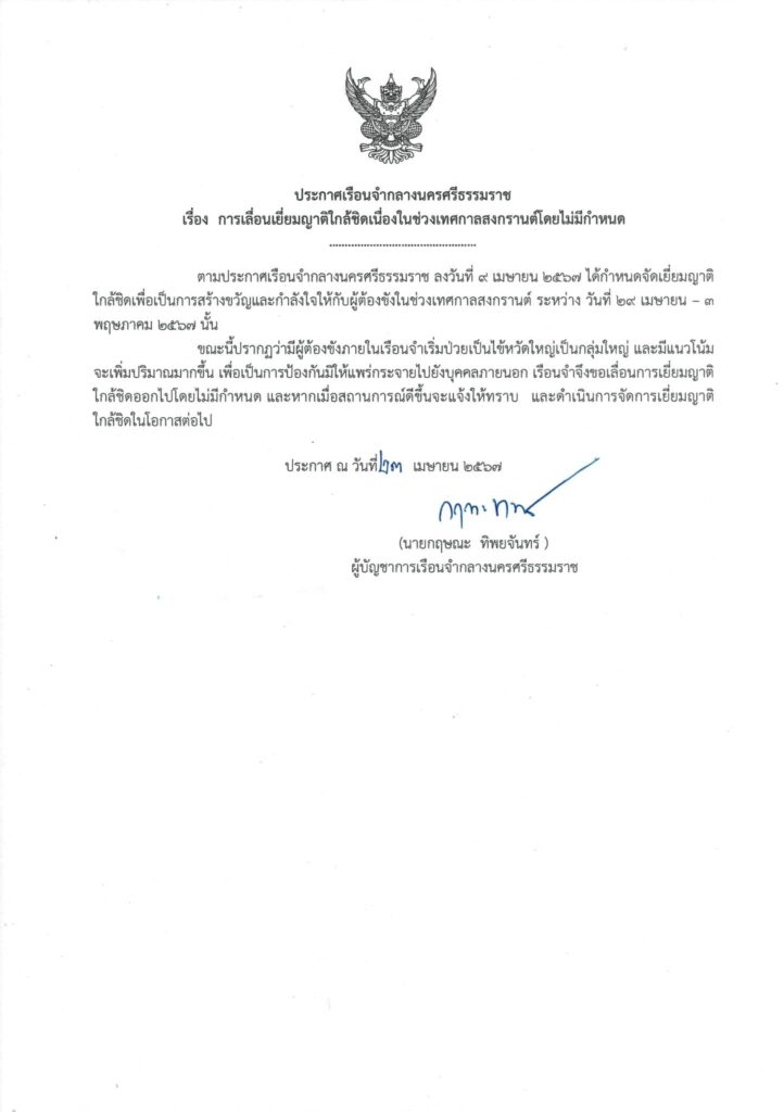 ผู้สื่อข่าวโตโจ้นิวส์รายงานว่า เรือนจำกลางนครศรีธรรมราช ออกประกาศโดยระบุว่า ประชาสัมพันธ์ญาติทุกๆ ท่าน เพื่อทราบ
