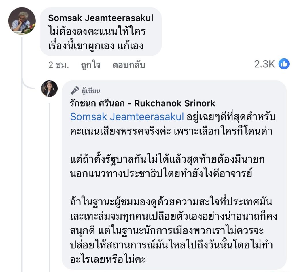รักชนก ตอบ สมศักดิ์เจียม ไม่เลือกใครเลยดีสำหรับคะแนนเสียงพรรคก็จริง แต่ในฐานะนักการเมืองเราไม่ควรปล่อยสถานการณ์ให้ไหลไป