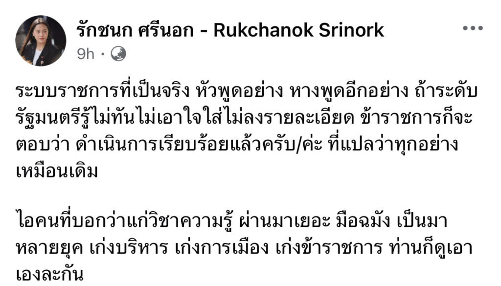 ไอซ์ รักชนก เชิญประชาชนดูเอาเอง ระบบข้าราชการ หัวกับหางพูดไม่ตรงกัน ที่บอกดำเนินการเรียบร้อย แปลว่าทุกอย่างเหมือนเดิม