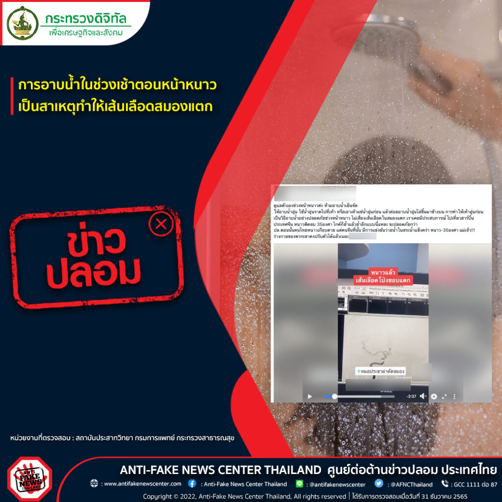 โซเชียล แชร์ข้อมูล การอาบน้ำในช่วงเช้าตอนหน้าหนาว เป็นสาเหตุทำให้เส้นเลือดสมองแตก ชี้เป็นข้อมูลเท็จ