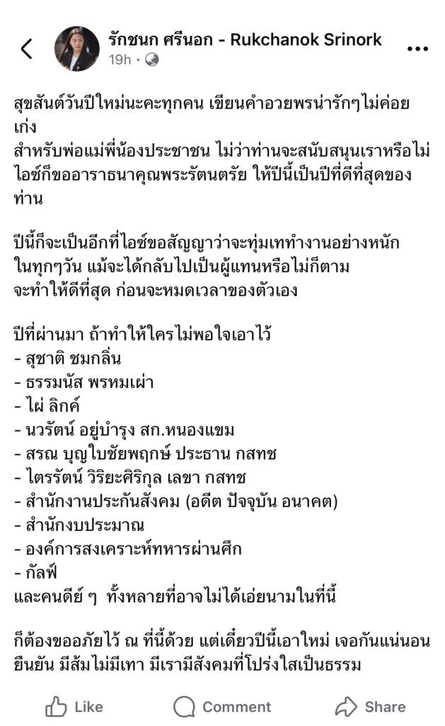 ผู้สื่อข่าวโตโจ้นิวส์รายงานว่า นางสาวรักชนก ศรีนอก ผู้สมัคร สส.บัญชีรายชื่อ พรรคประชาชน โพสต์ข้อความผ่านเฟซบุ๊ก ระบุว่า
