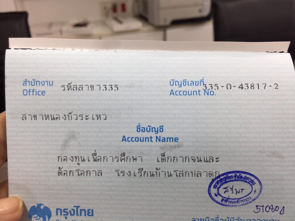 -บัญชีธนาคารกรุงไทย สาขาหนองบัวระเหวชื่อบัญชี กองทุนเพื่อการศึกษาเด็กยากจนและด้อยโอกาสโรงเรียนบ้านโสกปลาดุก เลขที่ 335-0-43817-2
