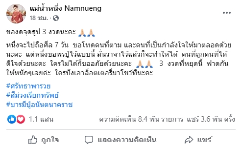 แม่น้ำหนึ่ง ประกาศ งดจุดธูป 3 งวด ก่อนโพสต์แซว ลุงตู่