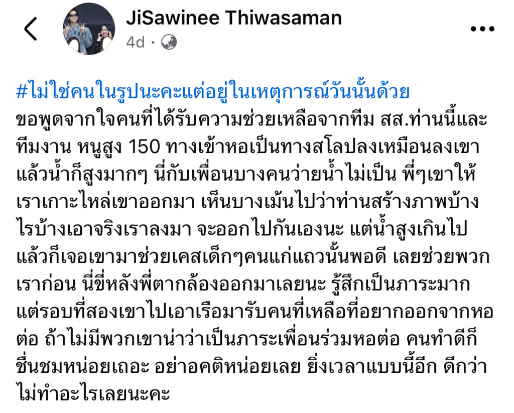ขอพูดจากใจคนที่ได้รับความช่วยเหลือจาก สส.ท่านนี้และทีมงาน หนูสูง 150 ทางเข้าหอเป็นทางสโลปลงเหมือนลงเขา แล้วน้ำก็สูงมากๆ นี่กับเพื่อนบางคนว่ายน้ำไม่เป็น พี่ๆเขาให้เราเกาะไหล่เขาออกมา เห็นบางเม้นไปว่าท่านสร้างภาพบ้าง ไรบ้างเอาจริงเราลงมา จะออกไปกันเองนะ แต่น้ำสูงเกินไป แล้วก็เจอเขามาช่วยเคสเด็กๆคนแก่แถวนั้นพอดี เลยช่วยพวกเราก่อน นี่ขี่หลังพี่ตากล้องออกมาเลยนะ รู้สึกเป็นภาระมาก แต่รอบที่สองเขาไปเอาเรือมารับคนที่เหลือที่อยากออกจากหอต่อ ถ้าไม่มีพวกเขาน่าว่าเป็นภาระเพื่อนร่วมหอต่อ คนทำดีก็ชื่นชมหน่อยเถอะ อย่าอคติหน่อยเลย ยิ่งเวลาแบบนี้อีก ดีกว่าไม่ทำอะไรเลยนะคะ