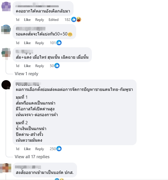 โดยโพสต์ดังกล่าว มีคนเข้ามาถูกใจกว่า 7,000 คน และเข้ามาแสดงความคิดเห็น เช่น คงอยากได้หลานอังเคิลกลับมา, ส้ม+แดง เมื่อไหร่ ฮุนเซ็น เฉิดฉาย เมื่อนั้น, ผลการเลือกตั้งย่อมส่งผลต่อการจัดการปัญหาชายแดนไทย-กัมพูชา