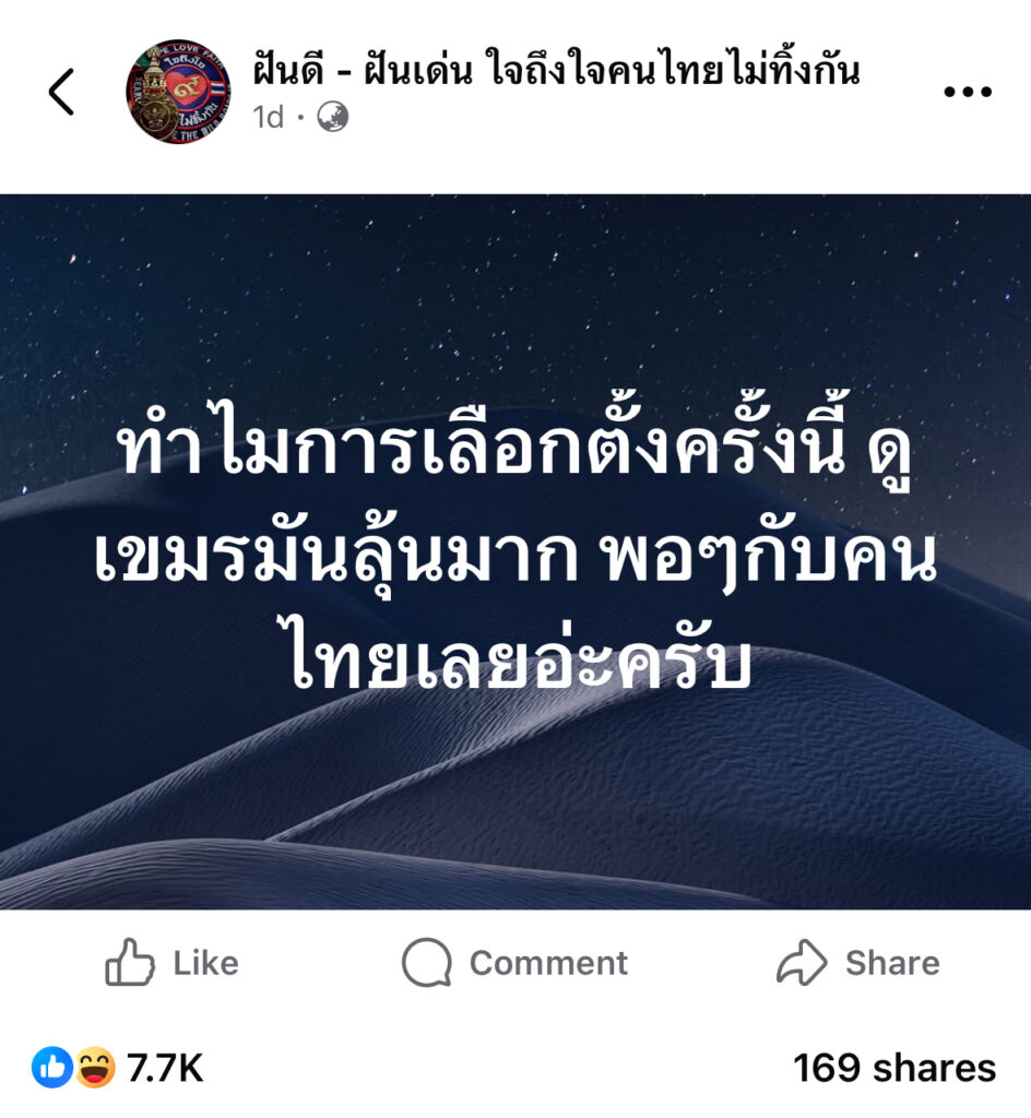 เพจเฟซบุ๊ก ฝันดี-ฝันเด่น ตั้งคำถาม การเลือกตั้งครั้งนี้ เขมรมันดูลุ้นมาก