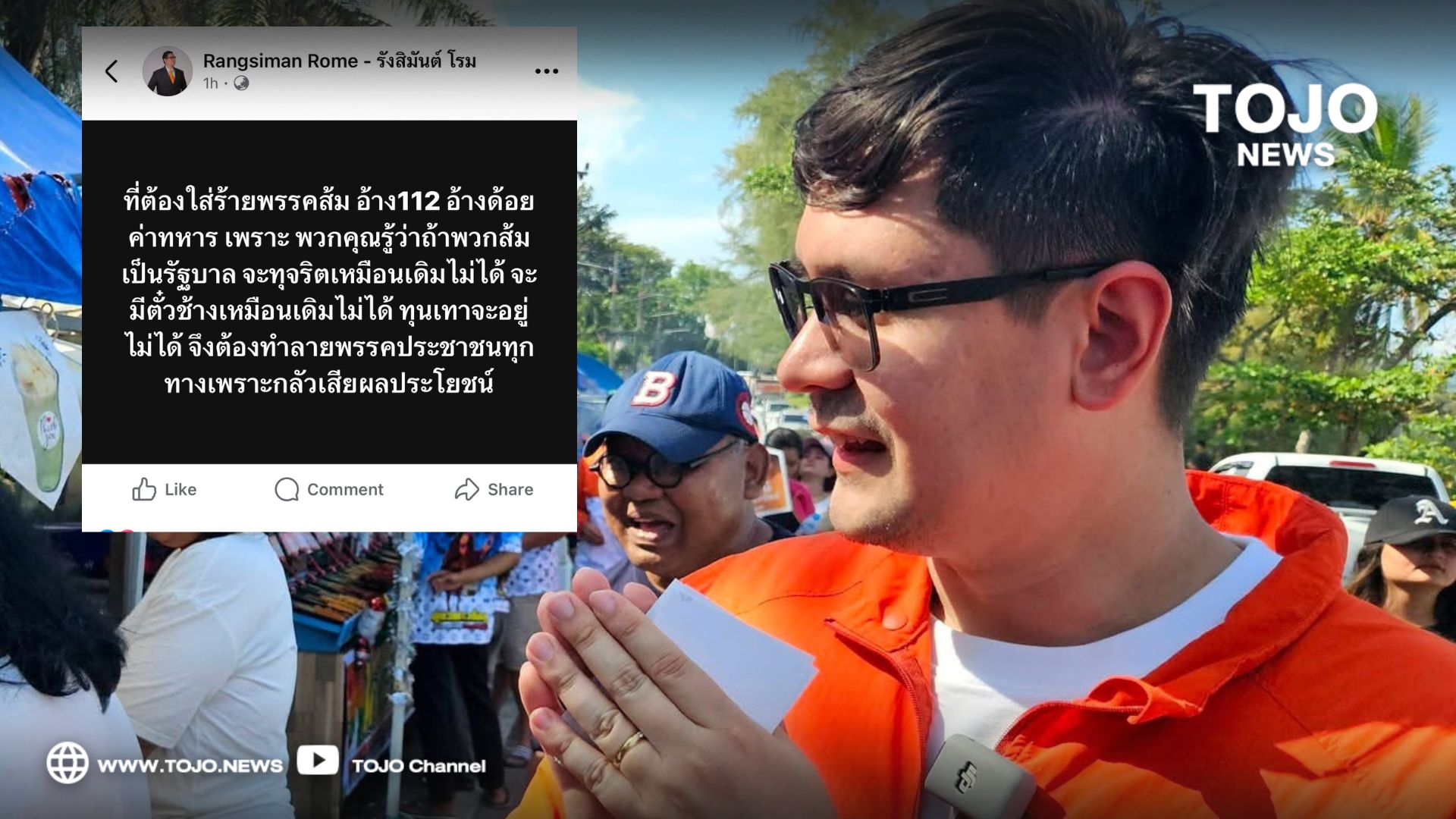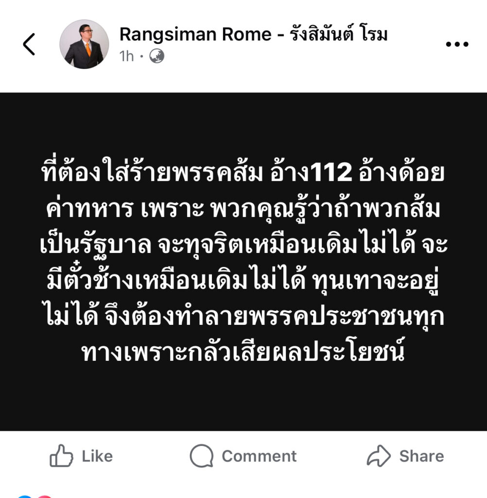 ผู้สื่อข่าวโตโจ้นิวส์รายงานว่า นายรังสิมันต์ โรม สส.บัญชีรายชื่อ พรรคประชาชน โพสต์ข้อความผ่านเฟซบุ๊ก ระบุว่า