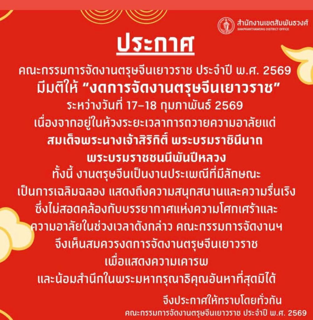 มติประกาศ “งดการจัดงานตรุษจีนเยาวราช 2569”
