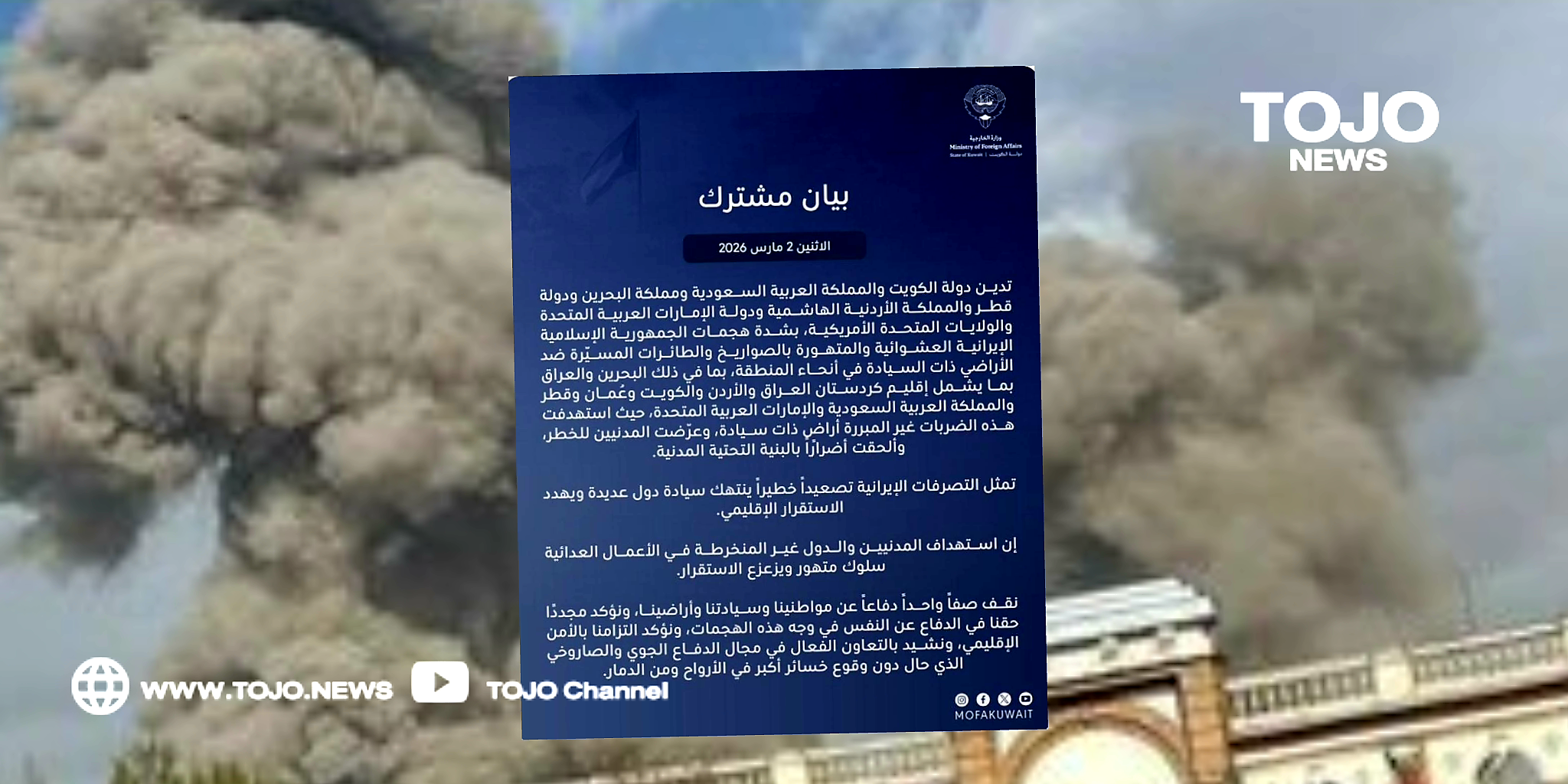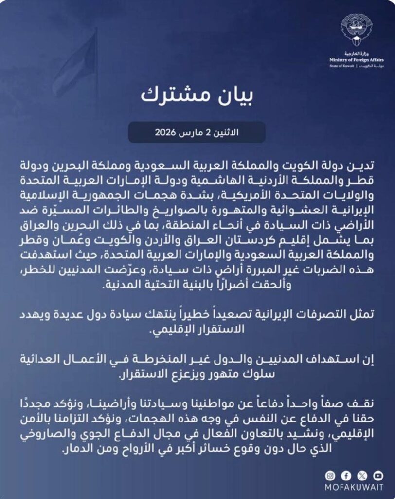 ผู้สื่อข่าวโตโจ้นิวส์รายงานว่า 2 มีนาคม พ.ศ. 2569 แถลงการณ์ร่วม รัฐคูเวต ราชอาณาจักรซาอุดีอาระเบีย ราชอาณาจักรบาห์เรน รัฐกาตาร์ ราชอาณาจักรฮาเชมิตแห่งจอร์แดน สหรัฐอาหรับเอมิเรตส์ และสหรัฐอเมริกา