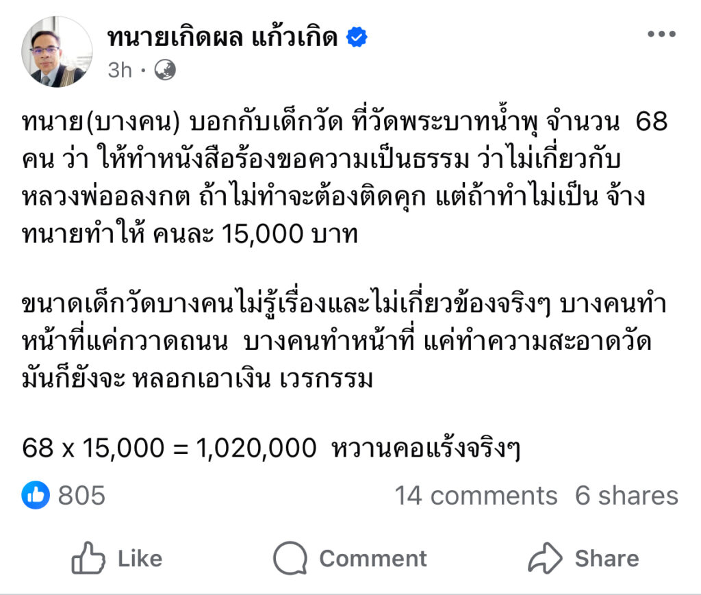 ทนายเกิดผล แฉ เรื่องพระบาทน้ำพุยังไม่จบ? มีทนายคนหนึ่ง สบโอกาส หลอกเอาเงินเด็กวัด ให้จ้างทำหนังสือปฏิเสธไม่เกี่ยวกับหลวงพ่ออลงกต