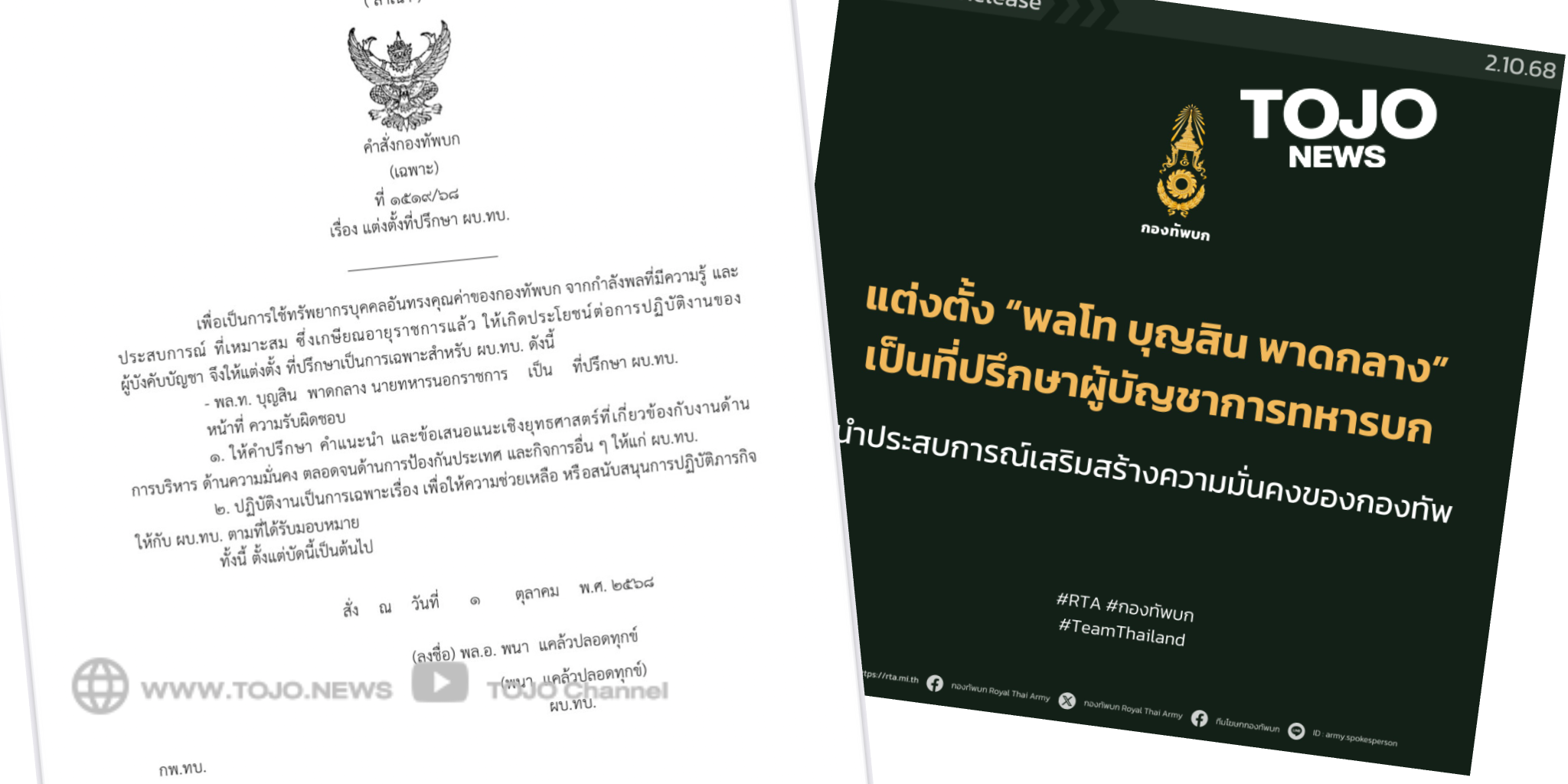 ผู้สื่อข่าวโตโจ้นิวส์รายงานว่า เมื่อวันที่ 1 ตุลาคม 2568 กองทัพบกได้ออกคำสั่งกองทัพบก (เฉพาะ) ที่ 1519/68 เรื่องแต่งตั้งที่ปรึกษาผู้บัญชาการทหารบก โดยแต่งตั้งให้ พลโท บุญสิน พาดกลาง นายทหารนอกราชการ ดำรงตำแหน่งที่ปรึกษาผู้บัญชาการทหารบก