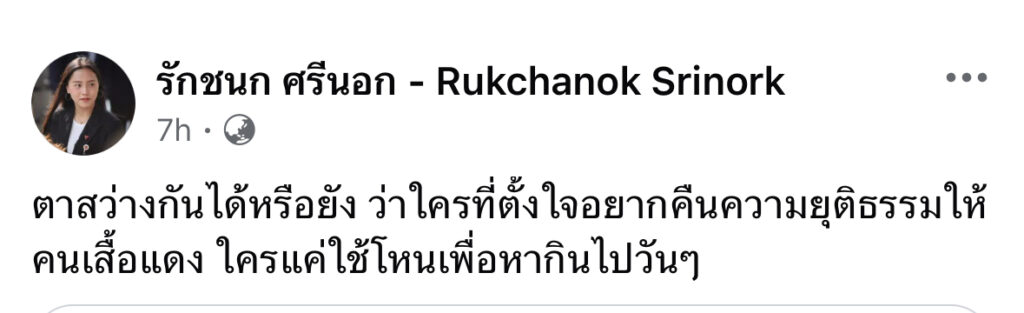 ล่าสุด นางสาวรักชนก ศรีนอก สส.บัญชีรายชื่อ พรรคประชาชน ออกมาแสดงความคิดเห็นดังกล่าว โดยระบุว่า ตาสว่างกันได้หรือยัง ว่าใครที่ตั้งใจอยากคืนความยุติธรรมให้คนเสื้อแดง ใครแค่ใช้โหนเพื่อหากินไปวันๆ