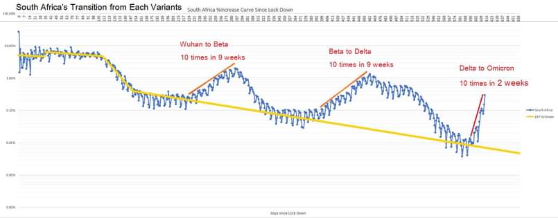 ครั้งที่ 1 จากไวรัส Wuhan มาเป็น Beta %Increase เพิ่มขึ้น 10 เท่าภายใน 9 สัปดาห์ ครั้งที่ 2 จาก Beta มาเป็น Delta มหาโหด %Increase เพิ่มขึ้น 10 เท่าภายใน 9 สัปดาห์ ครั้งที่ 3 ล่าสุด ชันสุด โหดสุด จาก Delta มาเป็น Omicron ระดับ Super Virus %Increase เพิ่มขึ้น 10 เท่าภายในเวลาแค่ 2 สัปดาห์!!!