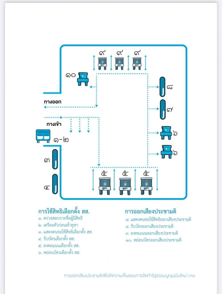 ตามผัง ประชาชนต้องเข้าคิว แสดงตน รับบัตรเลือกตั้ง 2 ใบ เข้าคูหา กาบัตร 2 ใบ ออกจากคูหาหย่อนบัตรใส่หีบ