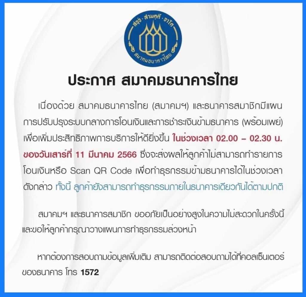 เนื่องด้วย สมาคมธนาคารไทย และธนาคารสมาชิก มีแผนการปรับปรุงระบบการโอนเงินและการชําระเงินข้ามธนาคาร (พร้อมเพย์) เพื่อเพิ่มประสิทธิภาพการบริการให้ดียิ่งขึ้น ช่วงเวลาที่ปิดระบบเวลา 02.00 – 02.30 น. ของวันเสาร์ที่ 11 มีนาคม 2566 ซึ่งจะส่งผลให้ลูกค้าไม่สามารถทํารายการโอนเงินหรือ Scan QR Code เพื่อทําธุรกรรมข้ามธนาคารได้ในช่วงเวลาดังกล่าว