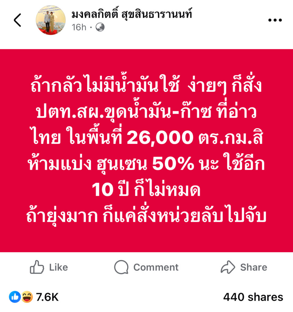 ถ้ากลัวไม่มีน้ำมันใช้ ง่ายๆ ก็สั่ง ปตท.สผ.ขุดน้ำมัน-ก๊าซ ที่อ่าวไทย ในพื้นที่ 26,000 ตร.กม.สิ ห้ามแบ่ง ฮุนเซน 50% นะ ใช้อีก 10 ปี ก็ไม่หมด