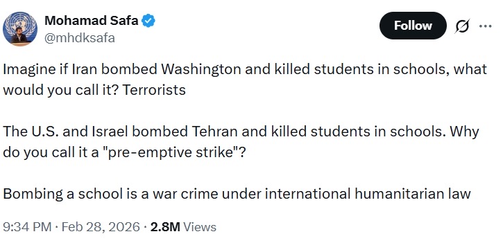 ผู้สื่อข่าวโตโจ้นิวส์รายงานว่า Mohamad Safa นักการทูตและผู้แทนประจำองค์การสหประชาชาติ โพสต์ข้อความผ่านเอ็กซ์ ระบุว่า