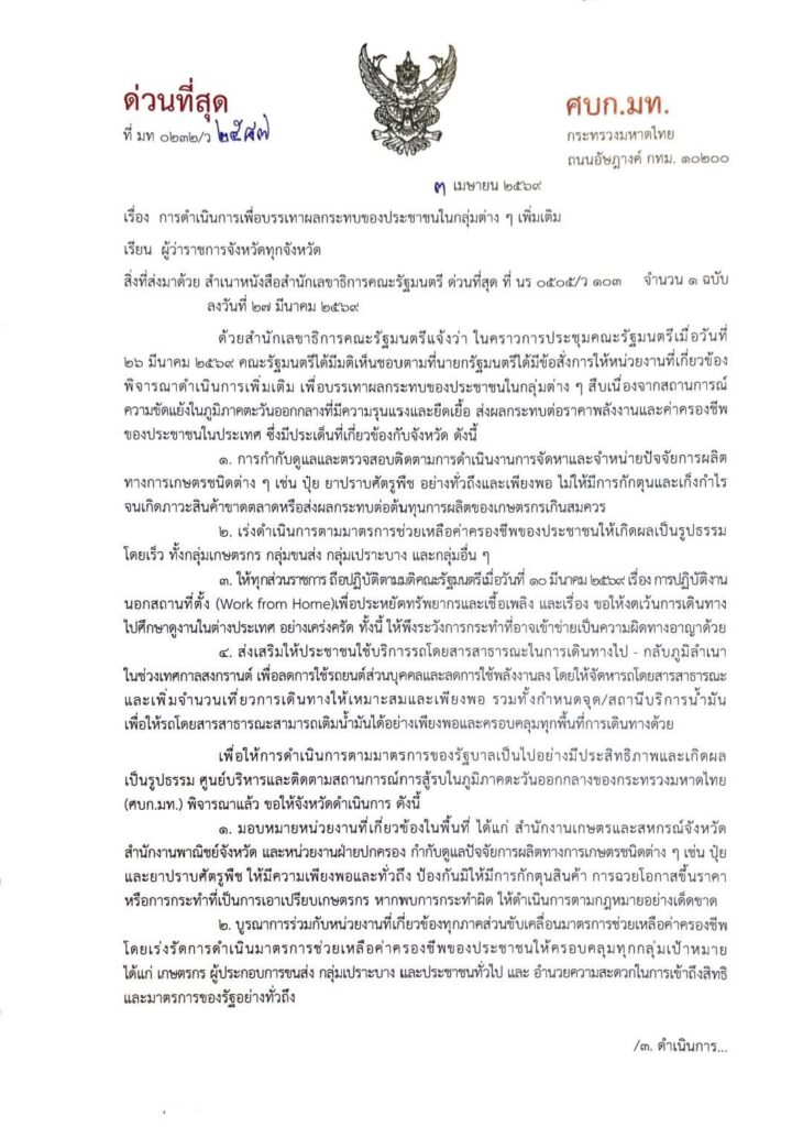 “เพื่อให้การขับเคลื่อนมาตรการช่วยเหลือเกิดผลเป็นรูปธรรมและครอบคลุมทุกมิติ ตนได้ลงนามในโทรสารสั่งการด่วนที่สุดถึงผู้ว่าราชการจังหวัดทั่วประเทศ ให้เร่งดำเนินการใน 4 มาตรการสำคัญเพิ่มเติม ได้แก่