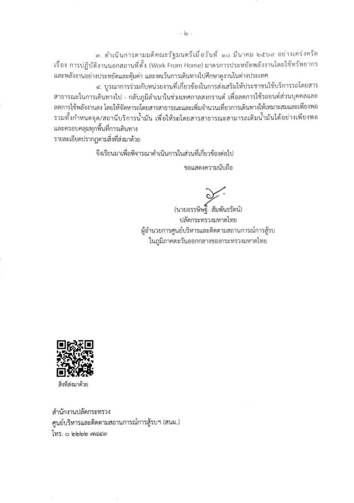 3. ดำเนินมาตรการที่เกี่ยวข้องกับการปฏิบัติราชการอย่างเคร่งครัด ทั้งการปฏิบัติงานนอกสถานที่ตั้ง (Work From Home) มาตรการประหยัดพลังงานโดยใช้ทรัพยากร และพลังงานอย่างประหยัดและคุ้มค่า และงดเว้นการเดินทางไปศึกษาดูงานในต่างประเทศ