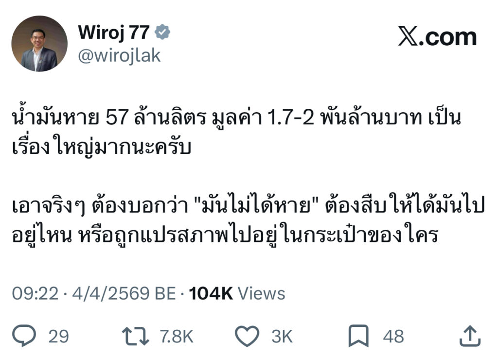 วิโรจน์ จี้ ตรวจสอบให้ได้ น้ำมันหาย 57 ล้านลิตรไปอยู่ไหน!