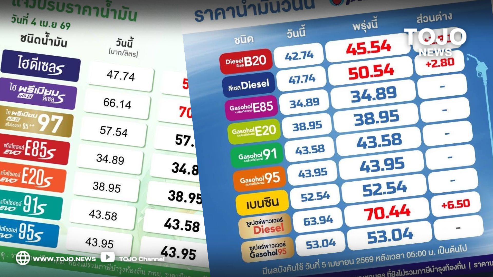ผู้สื่อข่าวโตโจ้นิวส์รายงานว่า วันนี้ (4 เม.ย. 2569) ที่ประชุมคณะกรรมการบริหารกองทุนน้ำมันเชื้อเพลิง (กบน.) มีมติลดการชดเชยอัตราเงินกองทุนน้ำมันในส่วนของน้ำมันดีเซล B7 ลง 2.61 บาทต่อลิตร จากเดิม 20.71 บาทต่อลิตร เป็น 18.10 บาทต่อลิตร และลดการชดเชยน้ำมันดีเซล B20 ลง 2.61 บาทต่อลิตร จากเดิม 22.22 บาทต่อลิตร เป็น 19.61บาทต่อลิตร เพื่อลดเงินไหลออกจาก 1,708.75 ล้านบาทต่อวัน เป็น 1,496.72 ล้านบาทต่อวัน ส่งผลให้ราคาขายปลีกน้ำมันดีเซล B7 สูงขึ้น 2.80 บาท/ ลิตร จาก 47.74 เป็น 50.54 บาทต่อลิตร และน้ำดีเซล B20 เพิ่มขึ้น 2.80 บาท/ลิตร จาก 42.75บาท/ลิตร เป็น 45.54 บาทต่อลิตร เพื่อให้สอดคล้องกับสภาวะตลาดและรักษาความมั่นคงทางสภาพคล่องของกองทุนฯ โดยมีผลตั้งแต่วันที่ 5 เม.ย. เป็นต้นไป