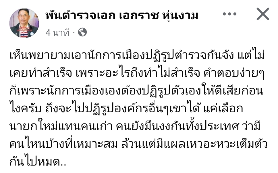 พ.ต.อ.เอกราช เผย เหตุปฏิรูปตำรวจไม่สำเร็จ คำตอบง่ายๆ ก็เพราะนักการเมืองเองต้องปฏิรูปตัวเอง