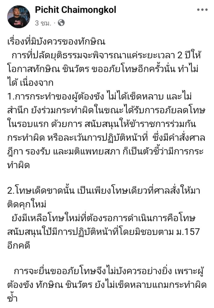 การจะยื่นขออภัยโทษจึงไม่บังควรอย่างยิ่ง เพราะผู้ต้องขัง ทักษิณ ชินวัตร ยังไม่เข็ดหลาบแถมกระทำผิดซ้ำ