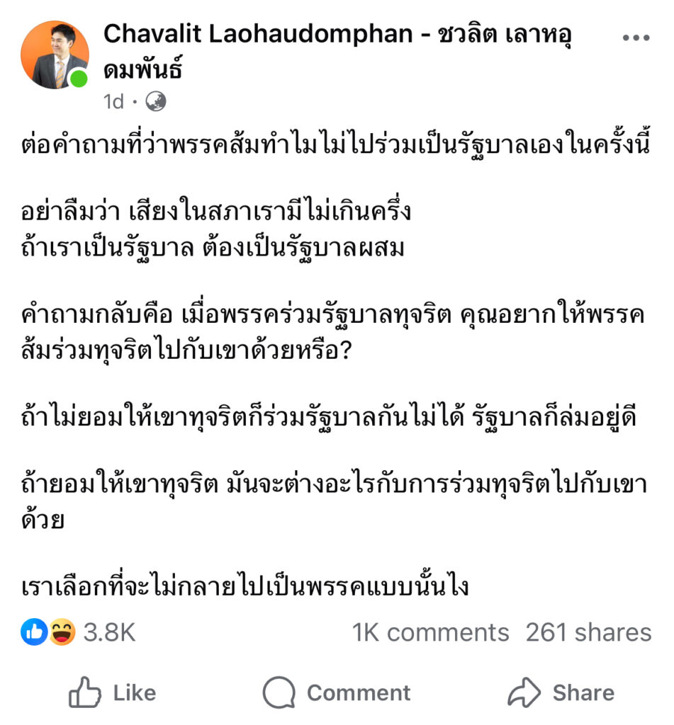 คำถามกลับคือ เมื่อพรรคร่วมรัฐบาลทุจริต คุณอยากให้พรรคส้มร่วมทุจริตไปกับเขาด้วยหรือ?