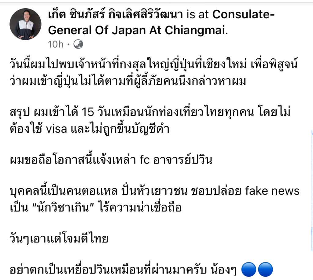 เก็ต พิสูจน์ตัวที่กงสุล ยังเข้าประเทศญี่ปุ่นได้ หลังเคยโดนปวินแจ้งความกับตำรวจญี่ปุน