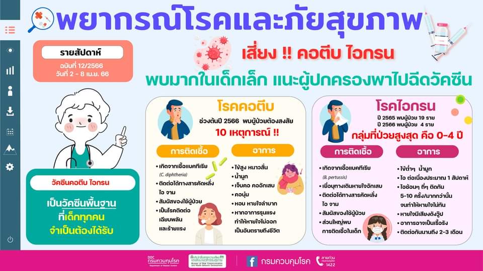 “จากการเฝ้าระวังของกรมควบคุมโรค สถานการณ์โรคที่ป้องกันได้ด้วยวัคซีน พบว่า สถานการณ์โรคไอกรน ในปี 2565 ที่ผ่านมา พบผู้ป่วย 19 ราย กลุ่มที่มีอัตราป่วยสูงสุด ได้แก่ 0-4 ปี รองลงมาคือ 45-54 ปี และ 25-34 ปี ตามลำดับ และในช่วงต้นปี 2566 พบผู้ป่วยแล้ว 4 ราย กลุ่มที่มีอัตราป่วยสูงสุด ได้แก่ 0-4 ปี รองลงมาคือ 7-9 ปี และ >65 ปี สำหรับสถานการณ์โรคคอตีบ ในช่วงปี 2564 – 2566 แม้จะยังไม่มีรายงานผู้ป่วยยืนยันตามระบบเฝ้าระวังทางระบาดวิทยา แต่จากการตรวจสอบข่าวการเฝ้าระวังเหตุการณ์ในช่วงต้นปี 2566 นี้ พบผู้ป่วยที่เข้าเกณฑ์รายงานสงสัยโรคคอตีบแล้ว 10 เหตุการณ์”