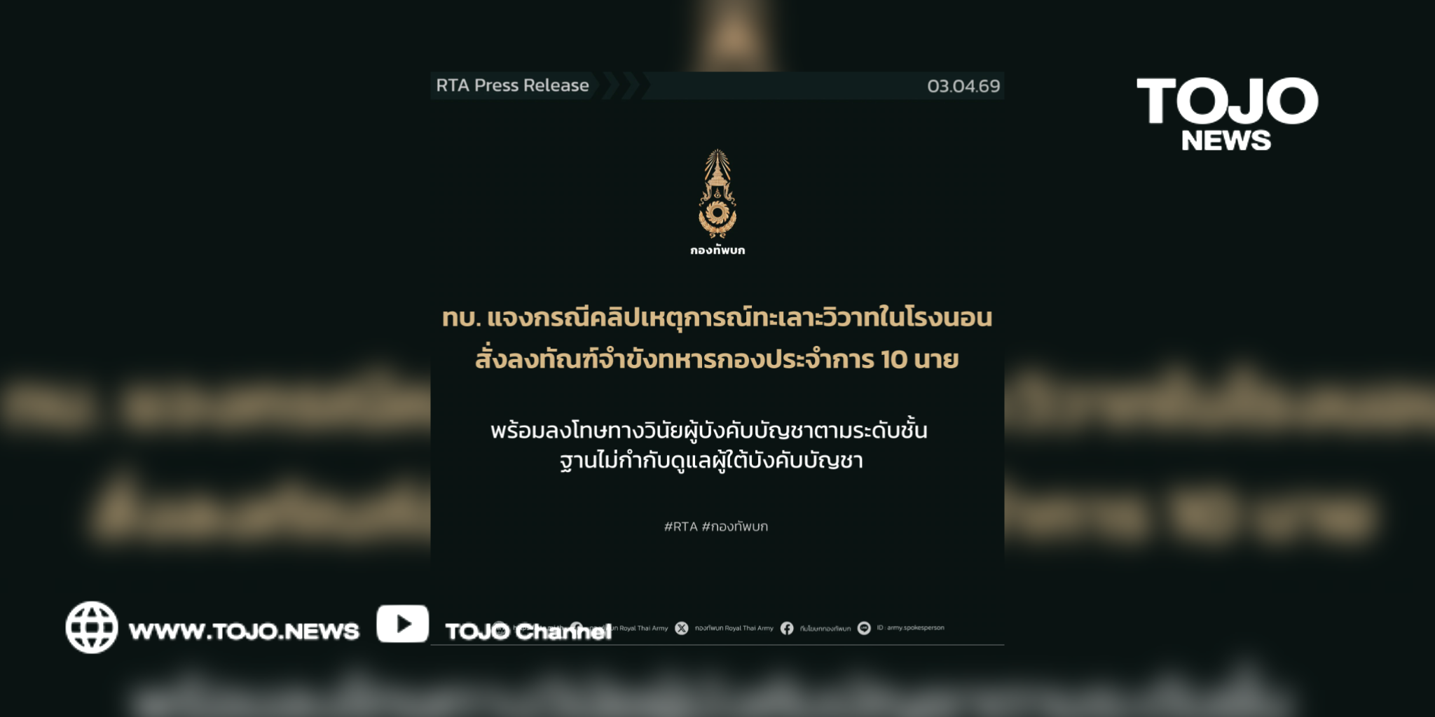 ผู้สื่อข่าวโตโจ้นิวส์รายงานว่า จากกรณีที่มีการเผยแพร่คลิปวิดีโอเหตุการณ์ทะเลาะวิวาทของทหารภายในอาคารโรงนอนผ่านสื่อสังคมออนไลน์นั้น กองทัพบกได้ตรวจสอบข้อมูลพบว่า เหตุการณ์ดังกล่าวเกิดขึ้นเมื่อวันที่ 27 มี.ค.69 ณ หน่วยทหารในสังกัดศูนย์การกำลังสำรอง ค่ายธนะรัชต์ จ.ประจวบคีรีขันธ์ โดยเป็นการทะเลาะวิวาทชกต่อยกันระหว่างทหารกองประจำการ ซึ่งมีสาเหตุมาจากปัญหาความขัดแย้งส่วนตัว