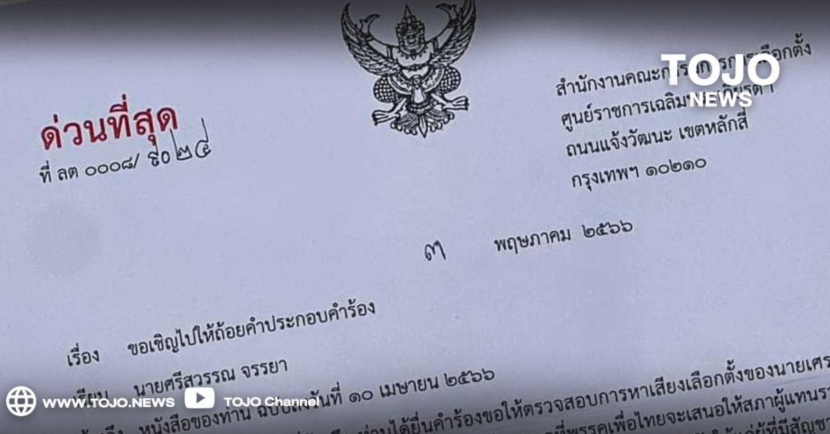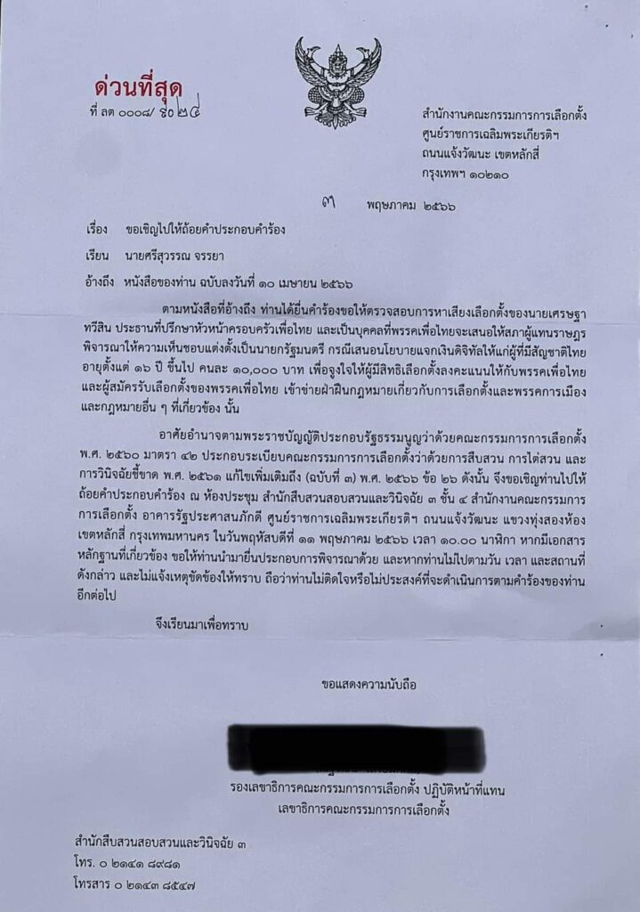 ผู้สื่อข่าวโตโจ้นิวส์รายงานว่า นายศรีสุวรรณ จรรยา เลขาธิการสมาคมองค์การพิทักษ์รัฐธรรมนูญไทย เปิดเผยว่า สมาคมฯได้รับหนังสือ “ด่วนที่สุด” จากสำนักงานคณะกรรมการการเลือกตั้ง (กกต.) เพื่อไปให้ถ้อยคำประกอบคำร้อง กรณีที่สมาคมได้ยื่นคำร้องขอให้ตรวจสอบการหาเสียงเลือกตั้งของนายเศรษฐา ทวีสิน แคนดิเดตนายกรัฐมนตรีของพรรคเพื่อไทย เสนอนโยบายแจกเงินดิจิทัล เป็นการจูงใจให้ผู้มีสิทธิเลือกตั้งลงคะแนนให้กับพรรคและผู้สมัครพรรคเพื่อไทย อันเป็นการฝ่าฝืนกฎหมายเกี่ยวกับการเลือกตั้งและพรรคการเมืองและกฎหมายอื่นๆที่เกี่ยวข้องหรือไม่