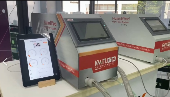 อธิการบดี สจล.กล่าวต่อไปว่า วันนี้ สจล. ได้คิดค้นและพัฒนาต้นแบบ “เครื่องจ่ายออกซิเจน KMITL High Flow” เครื่องจ่ายออกซิเจนในอัตราการไหลสูงเป็นครั้งแรก ที่มาพร้อมระบบมอนิเตอร์ทางไกล มุ่งลดอัตราการเสียชีวิตของผู้ป่วยโควิด-19 ให้น้อยลง ลดภาระงานและลดความเสี่ยงต่อการติดเชื้อของบุคลากรทางการแพทย์ที่ต้องเดินเข้า-ออกบริเวณหอผู้ป่วย ให้สามารถปฏิบัติหน้าที่ในส่วนอื่นได้อย่างเต็มประสิทธิภาพ ซึ่งได้รับการออกแบบมาเพื่อรับมือโควิดระลอกใหม่โดยเฉพาะ ซึ่งเวลานี้เครื่องนี้มีความสำคัญที่สุด และสจล.ได้พัฒนาและสร้างขึ้น ซึ่งข้อดีคือราคาเบื้องต้นเพียง 50,000 กว่าบาท ถูกกว่าราคาในต่างประเทศ 5-6 เท่า และการใช้งานก็ใช้ได้ง่ายกว่า บุคลากรทางการแพทย์สามารถควบคุมเครื่องจ่ายออกซิเจนผ่านโทรศัพท์มือถือได้ทุกที่ ทุกเวลา ตลอด 24 ชั่วโมง ทั้งยังสามารถเซ็นเซอร์อาการตอบสนองของผู้ป่วยได้ทันท่วงที โดยไม่ต้องเข้าไปสัมผัสกับผู้ป่วย