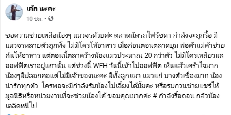 ผู้สื่อข่าวโตโจ้นิวส์รายงานว่า ผู้ใช้เฟซบุ๊กชื่อคุณเค้กนะคะ ได้โพสต์ภาพพร้อมเรื่องราวระบุว่า “ขอความช่วยเหลือน้องๆ แมวจรด้วยค่ะ ตลาดนัดรถไฟรัชดา กำลังจะถูกรื้อ มีแมวจรหลายตัวถูกทิ้ง ไม่มีใครให้อาหาร เมื่อก่อนตอนตลาดบูม พ่อค้าแม่ค้าช่วยกันให้อาหาร แต่ตอนนี้ตลาดร้างน้องแมวประมาณ 20 กว่าตัว ไม่มีใครเหลียวแล ออฟฟิตเราอยู่แถวนั้น