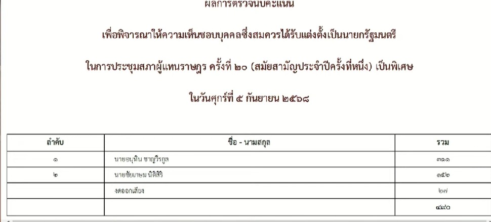 ผู้สื่อข่าวโตโจ้นิวส์รายงานว่า วันนี้ (5 ก.ย.68) เวลา 15.00 น. ที่ประชุมสภาผู้แทนราษฎรประชุมนัดพิเศษ มีวาระการโหวตให้ความเห็นชอบบุคคลซึ่งสมควรได้รับแต่งตั้งเป็นนายกรัฐมนตรี ตามรัฐธรรมนูญมาตรา 159 โดยมีรายชื่อแคนดิตเดตนายกรัฐมนตรี 2 คนด้วยกัน ประกอบด้วยนายอนุทิน ชาญวีรกุล หัวหน้าพรรคภูมิใจไทย และนายชัยเกษม นิติสิริ จากพรรคเพื่อไทย
