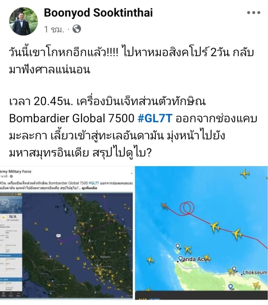 เวลา 20.45น. เครื่องบินเจ็ทส่วนตัวทักษิณ Bombardier Global 7500 GL7T ออกจากช่องแคบมะละกา เลี้ยวเข้าสู่ทะเลอันดามัน มุ่งหน้าไปยังมหาสมุทรอินเดีย สรุปไปดูไบ?