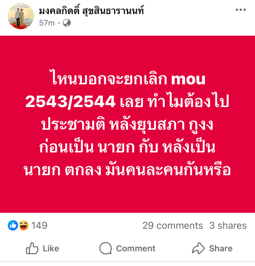ไหนบอกจะยกเลิก mou 2543/2544 เลย ทำไมต้องไป ประชามติ หลังยุบสภา กูงง ก่อนเป็น นายก กับ หลังเป็น นายก ตกลง มันคนละคนกันหรือ