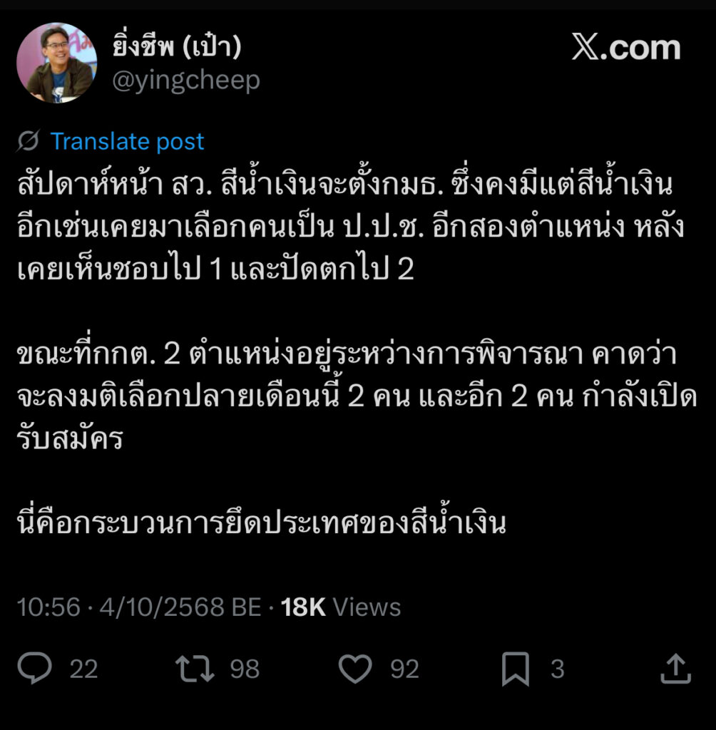 ผู้สื่อข่าวโตโจ้นิวส์รายงานว่า นายยิ่งชีพ อัชฌานนท์ ผู้จัดการ iLaw โพสต์ข้อความผ่านเฟซบุ๊ก ระบุว่า