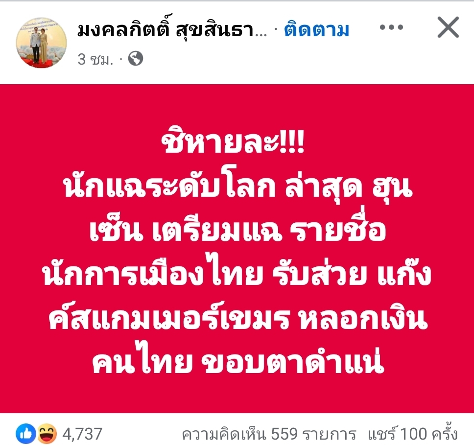 นักแฉระดับโลก ล่าสุด ฮุนเซน เตรียมแฉ รายชื่อ นักการเมืองไทย รับส่วย แก๊งสแกมเมอร์เขมร หลอกเงินคนไทย ขอบตาดำแน่