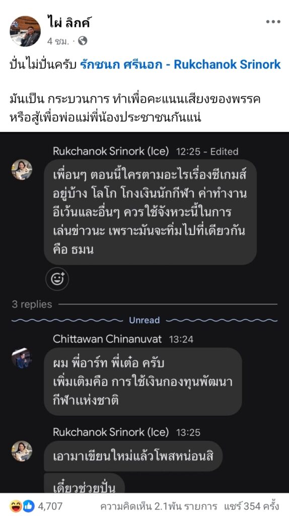 ล่าสุด นายไผ่ ลิกค์ สส.กำแพงเพชร พรรคกล้าธรรม (กธ.) โพสต์เฟซบุ๊กถามว่า “ปั่นไม่ปั่นครับ รักชนก ศรีนอก – Rukchanok Srinork มันเป็น กระบวนการ ทำเพื่อคะแนนเสียงของพรรคหรือสู้เพื่อพ่อแม่พี่น้องประชาชนกันแน่ ? ”