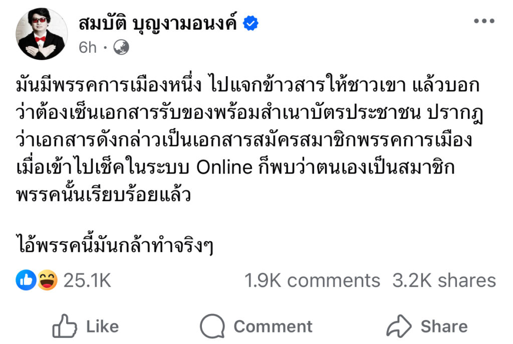 มันมีพรรคการเมืองหนึ่ง ไปแจกข้าวสารให้ชาวเขา แล้วบอกว่าต้องเซ็นเอกสารรับของพร้อมสำเนาบัตรประชาชน ปรากฎว่าเอกสารดังกล่าวเป็นเอกสารสมัครสมาชิกพรรคการเมือง เมื่อเข้าไปเช็คในระบบ Online ก็พบว่าตนเองเป็นสมาชิกพรรคนั้นเรียบร้อยแล้ว