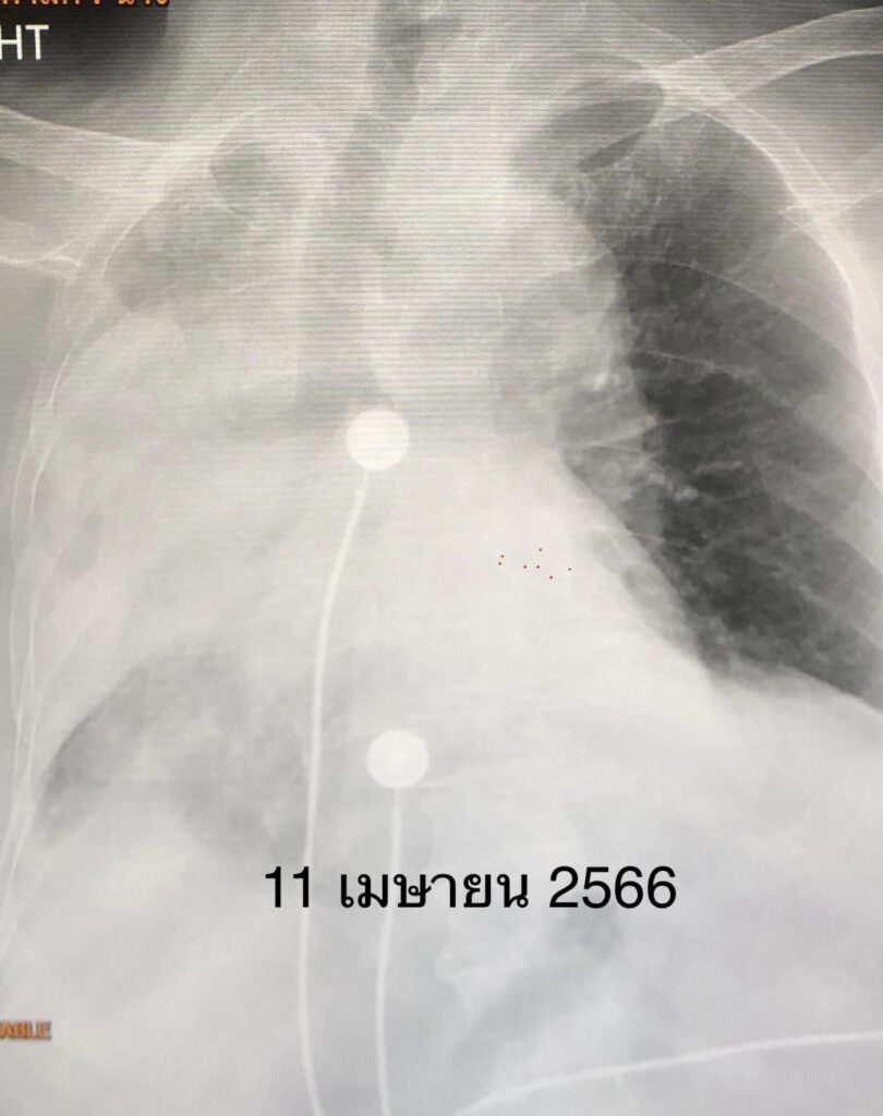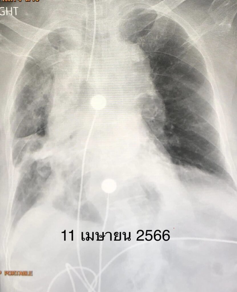 คืนที่เข้านอนในโรงพยาบาล เหนื่อยมากขึ้น เอกซเรย์ปอดพบปอดขวาทั้งข้างขาว (ดูรูป) เชื้อไวรัสโควิด-19 ทำให้เสมหะข้นเหนียวจนอุดหลอดลม ปอดขวาทั้งข้างแฟบ ต้องใส่ท่อหายใจและเครื่องช่วยหายใจ